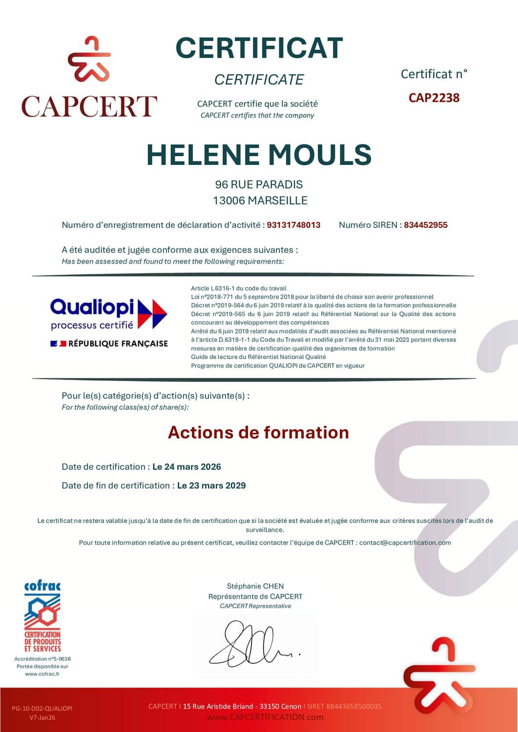 N° Siret 83445295500042 - N°OF 93131748013 © Tous droits réservés Canis Wellness Hélène Mouls EI - 2026 - Certification Qualiopi